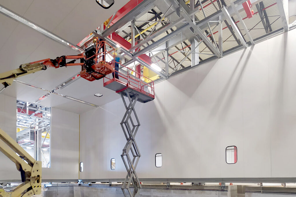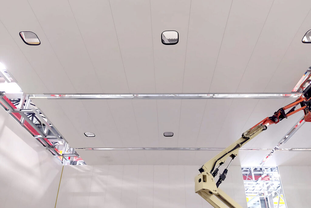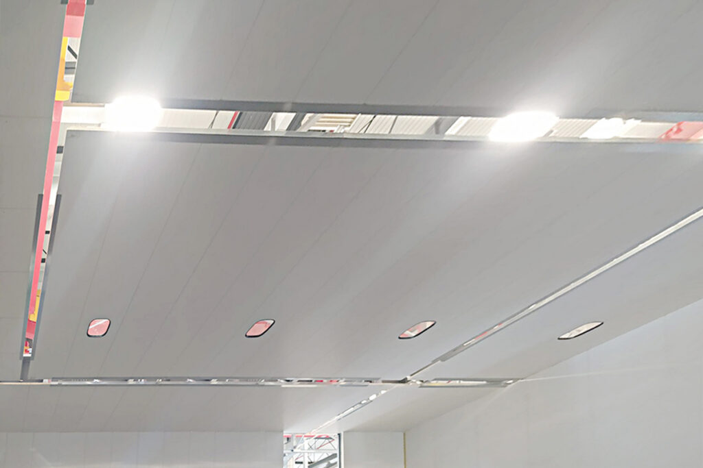 Una delle soluzioni più ingegnose del progetto riguarda l’illuminazione. Per evitare qualsiasi contatto tra i componenti elettrici e l’atmosfera corrosiva, i corpi illuminanti sono installati all’esterno del tunnel. La luce filtra all’interno attraverso una serie di oblò in policarbonato preinstallati direttamente sui pannelli delle pareti e del soffitto. Questa soluzione non solo elimina ogni rischio di corrosione dei componenti elettrici, ma semplifica drasticamente le operazioni di manutenzione, che possono essere eseguite dall’esterno senza interrompere le attività all’interno del tunnel e senza compromettere la tenuta ermetica della camera.